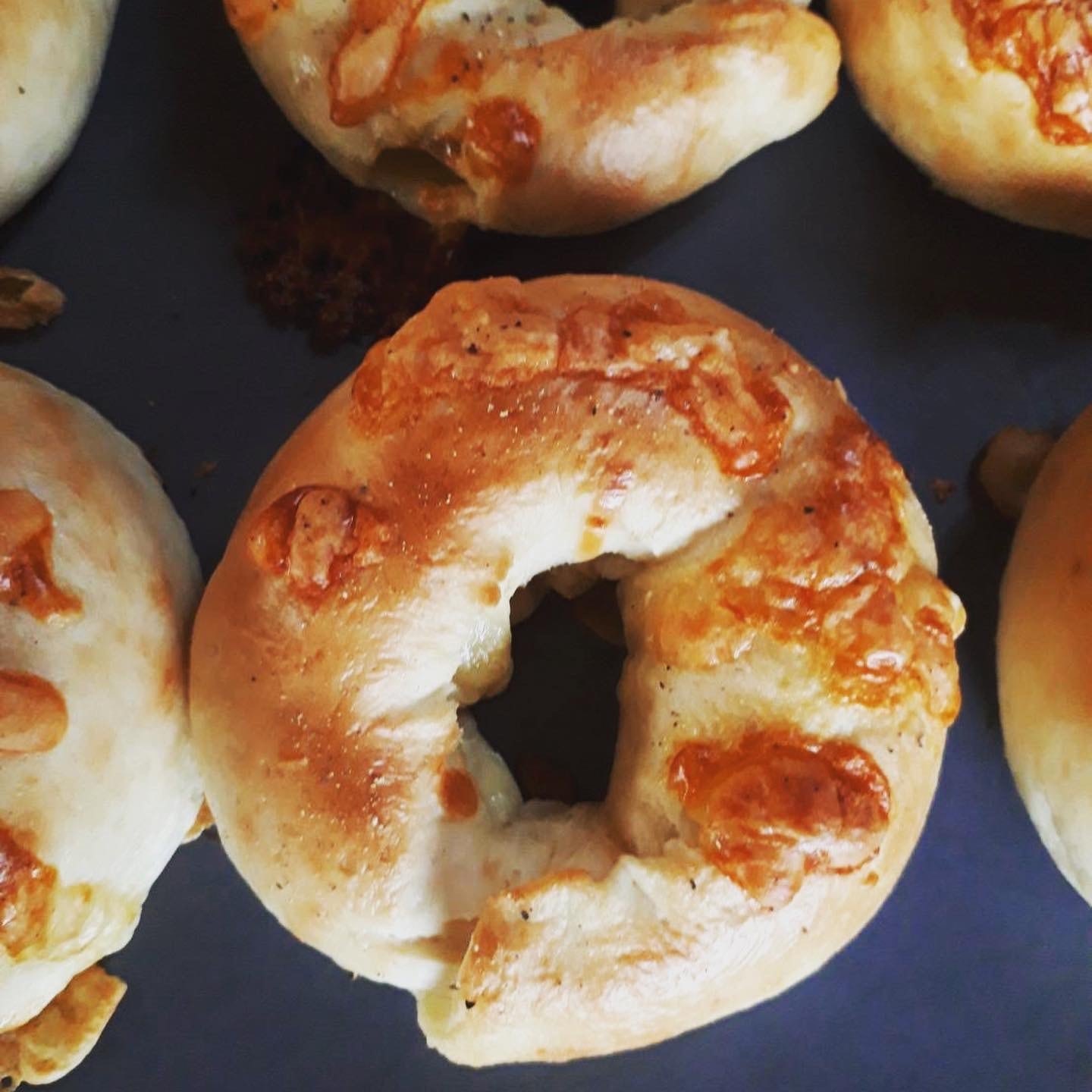 中にチーズとベーコンがたっぷり、上にもチーズをのせ香ばしく仕上げました