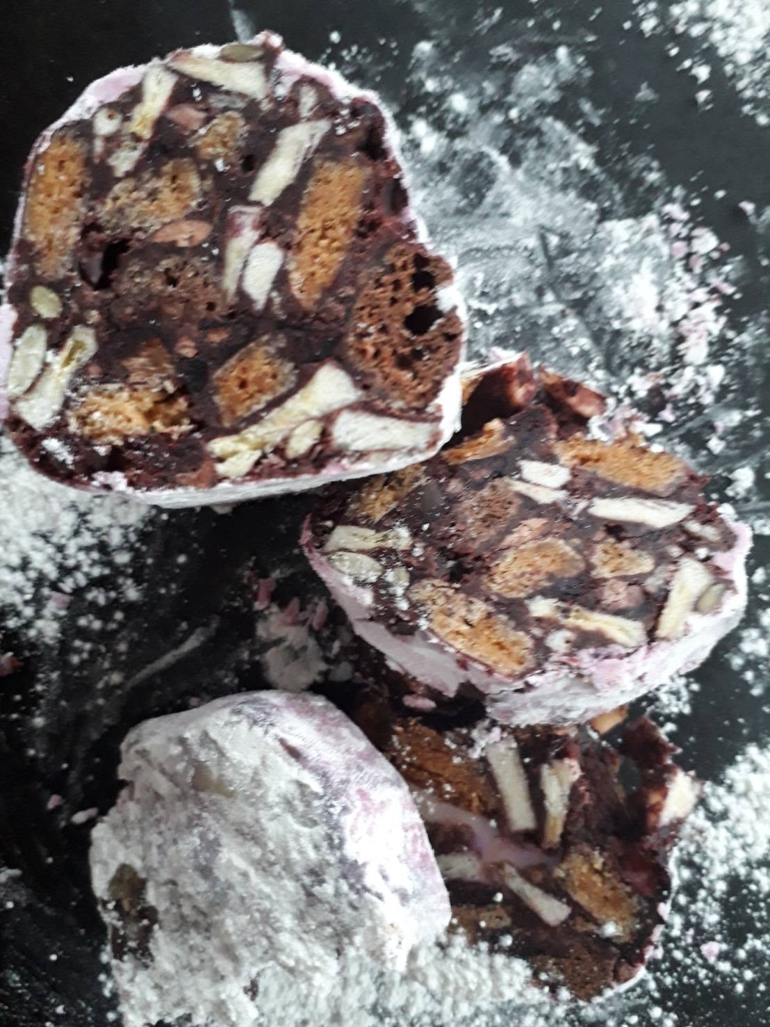 寒い季節になると焼き菓子が食べたくなる。クリスマスの時期になるとシュトーレンと同じくらい食べたくなるのが、チョコサラミ。ドライイチジクとバナナチップ・自家製ナツハゼジャム・mushamushaの手作りクッキーをクーベルチュールチョコで固めます。ナツハゼが入ることでさっぱりとした甘さに。色々な食感が楽しめる1品です。